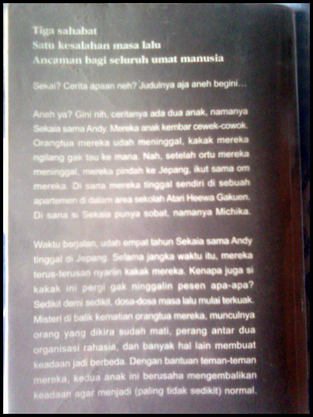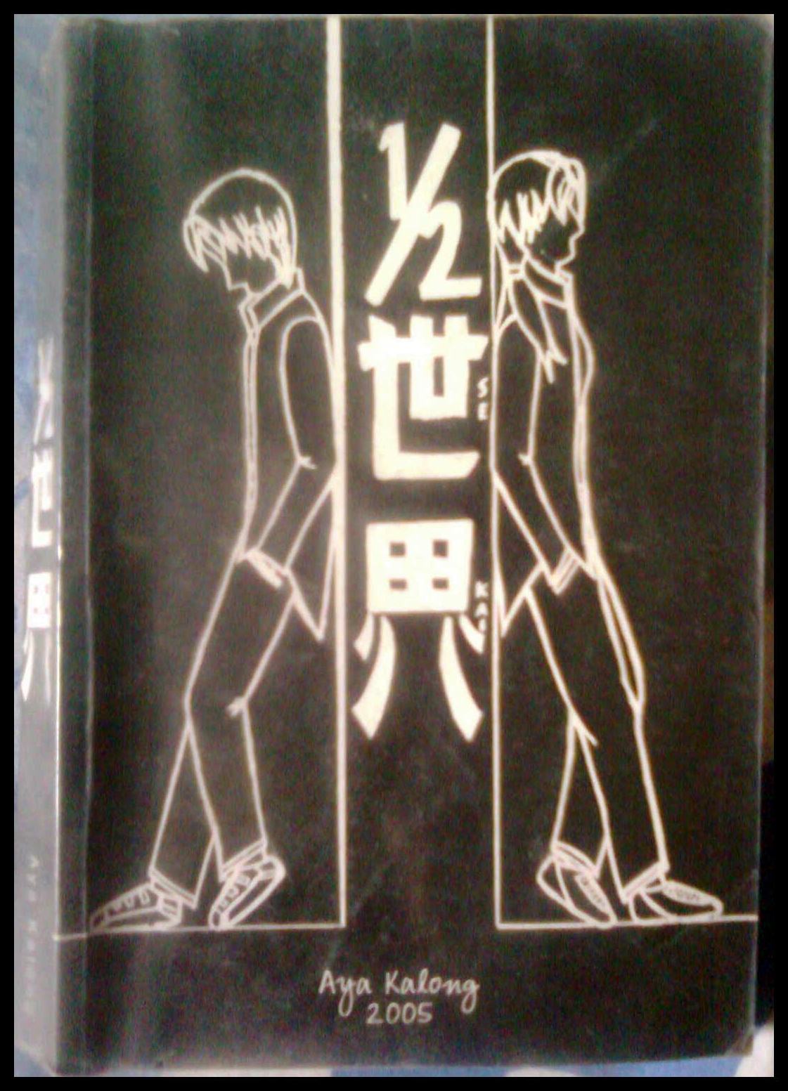 Judul buku ini adalah 1/2 Sekai. Sekai itu merupakan bahasa jepang dan dalam bahasa Indonesia berarti Dunia. Meskipun ceritanya emang rada 'aneh' dan sedikit mengantung, tapi gw tetep suka sama buku ini. Udah lama gw nyari sekuelnya *karna ceritanya gantung, makanya gw pikir pasti bakalan ada lanjutannya*, tapi belom dapet sampe sekarang. Atau memang ga ada lanjutannya? Gw juga ga tau deh. Nama pengarangnya aja udah 'aneh', Aya Kalong. Gw yakin tuh pengarang demen nginsom juga kaya gw, bhahaha. Sayangnya di buku ini ga ada biodata pengarangnya, (si Aya Kalong) ini. Hmmmhh, buku yang aneh, pengarang yang aneh, dan pembaca yang aneh, pas deh kalo gitu, haha :p.